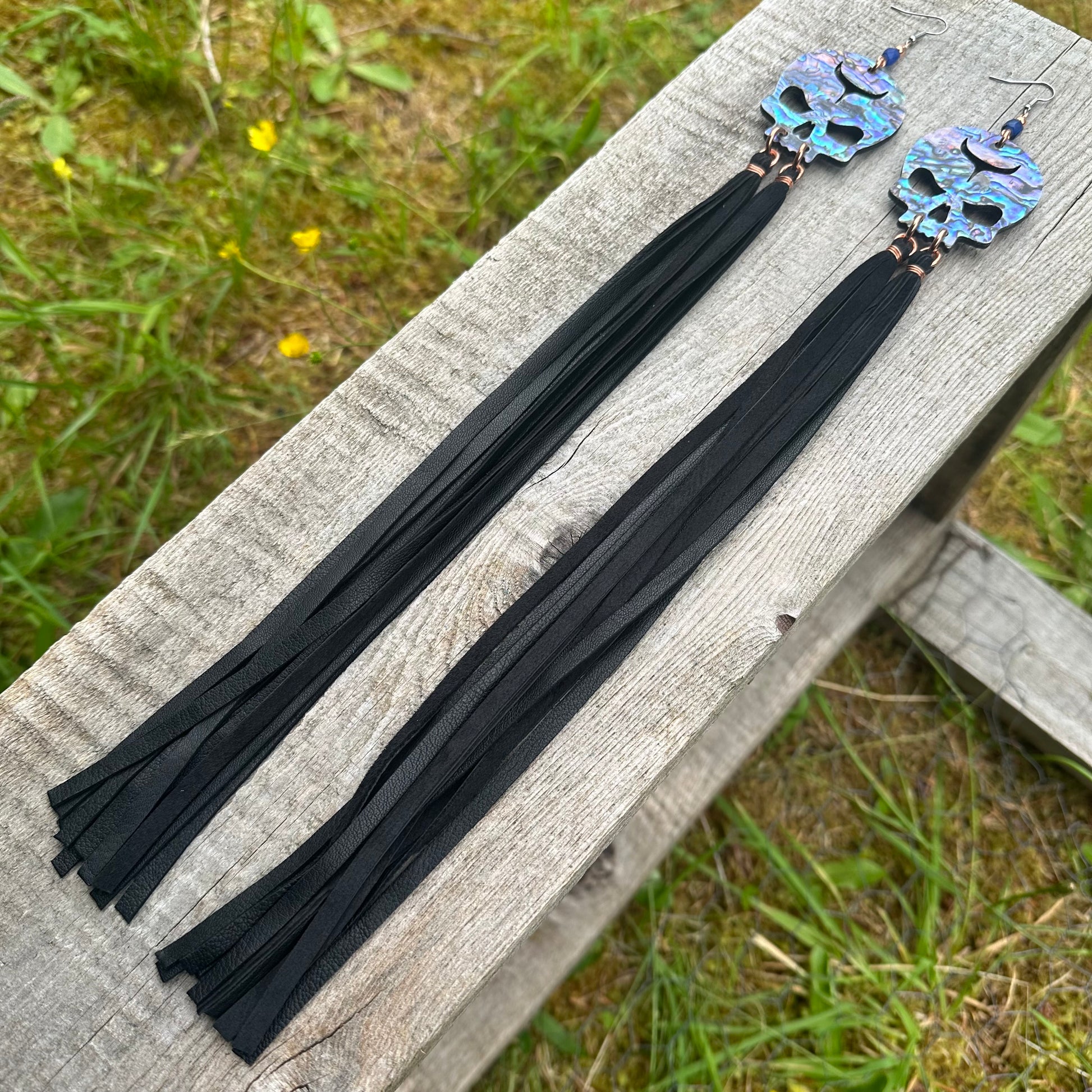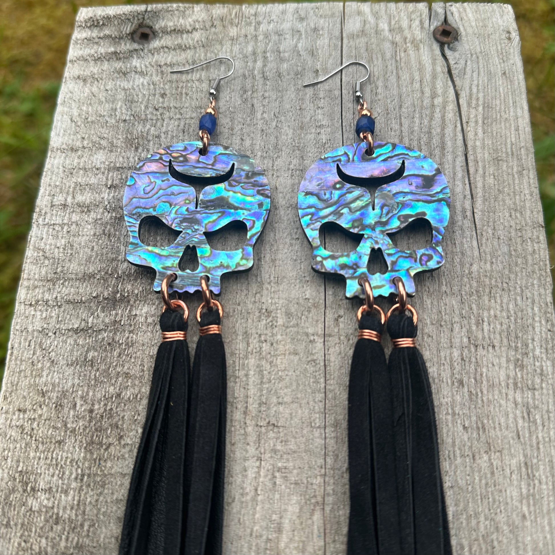 Ancestor Haida Abalone on Acrylic Skull Earrings w Russian Blue Trade Beads, Copper Beads, Deer Skin Fringe. Just under 2” Wide & 14” Long