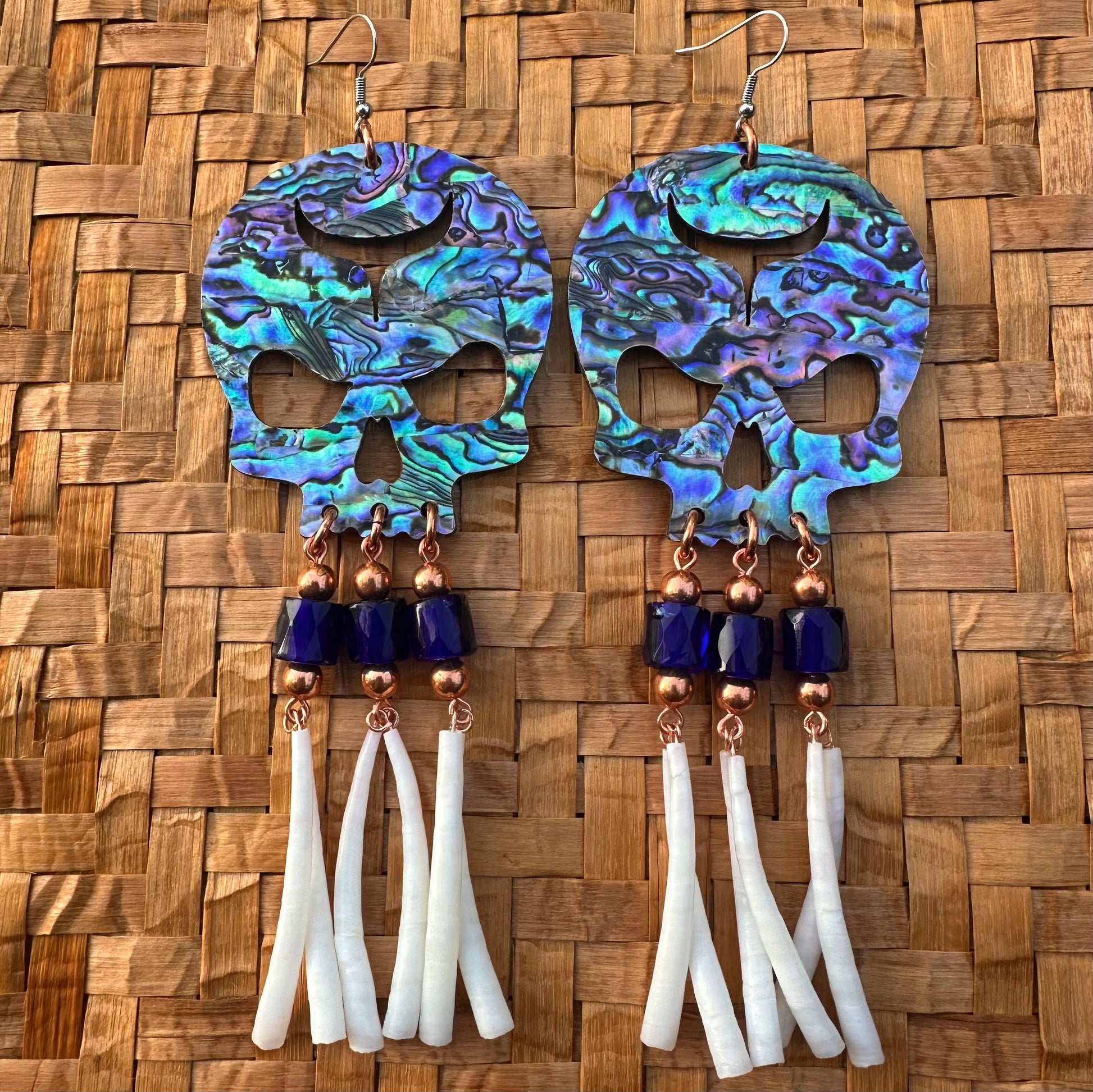 - Abalone On Acrylic Ancestor Skull Earrings with New Gen Trade Beads, Copper Beads, Dentalium Dangles and Copper Findings.