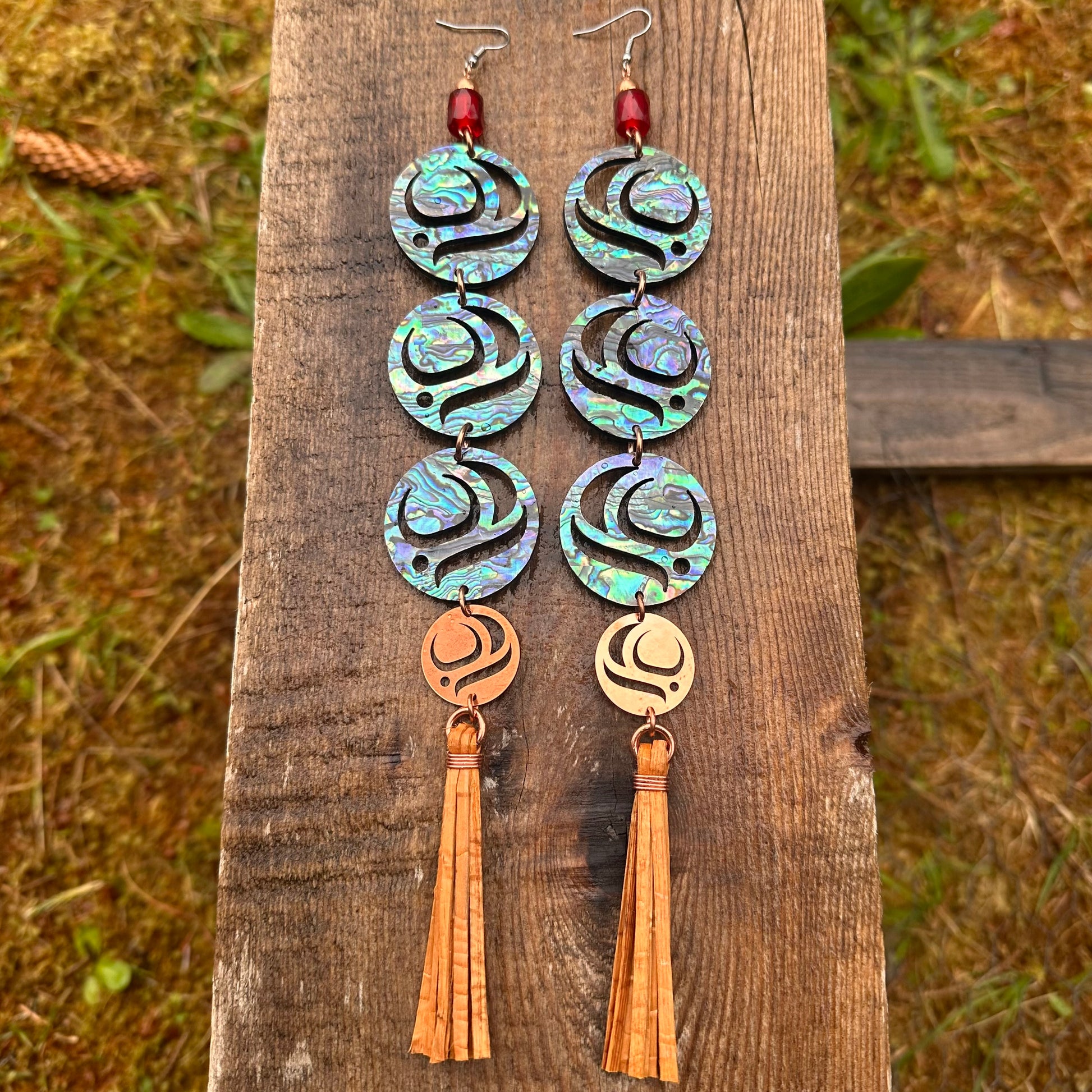 - Copper & Red New Gen Trade Bead, Abalone on Acrylic Salmon Eggs, Copper Salmon Egg, Cedar Fringe & Copper Findings 1.5” Wide x 10” Long