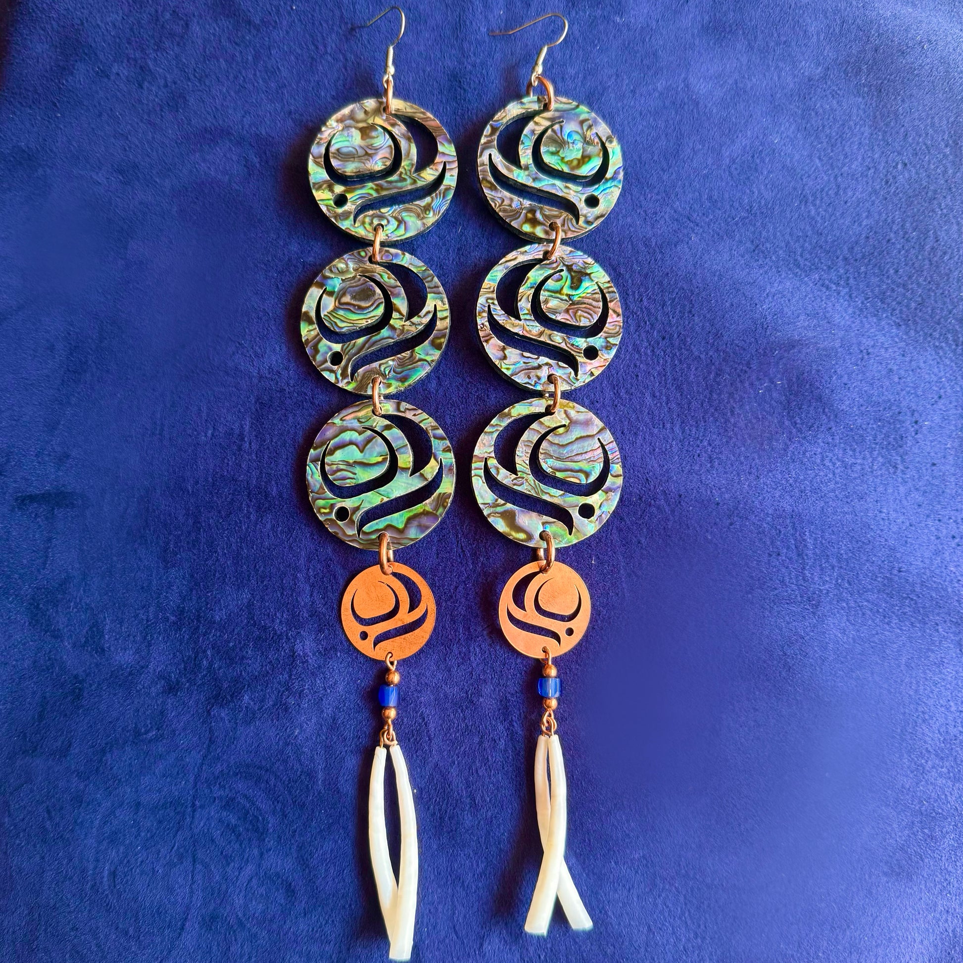 - Abalone on Acrylic Salmon Eggs, Copper Salmon Eggs, Copper and Russian Blue Trade Beads, Dentalium Dangle, Copper Finding.